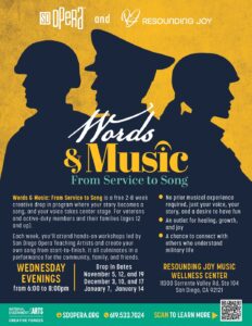 Words & Music: From Service to Song is a free 2-8 week creative drop in program where your story becomes a song, and your voice takes center stage. For veterans and active-duty members and their families (ages 12 and up).